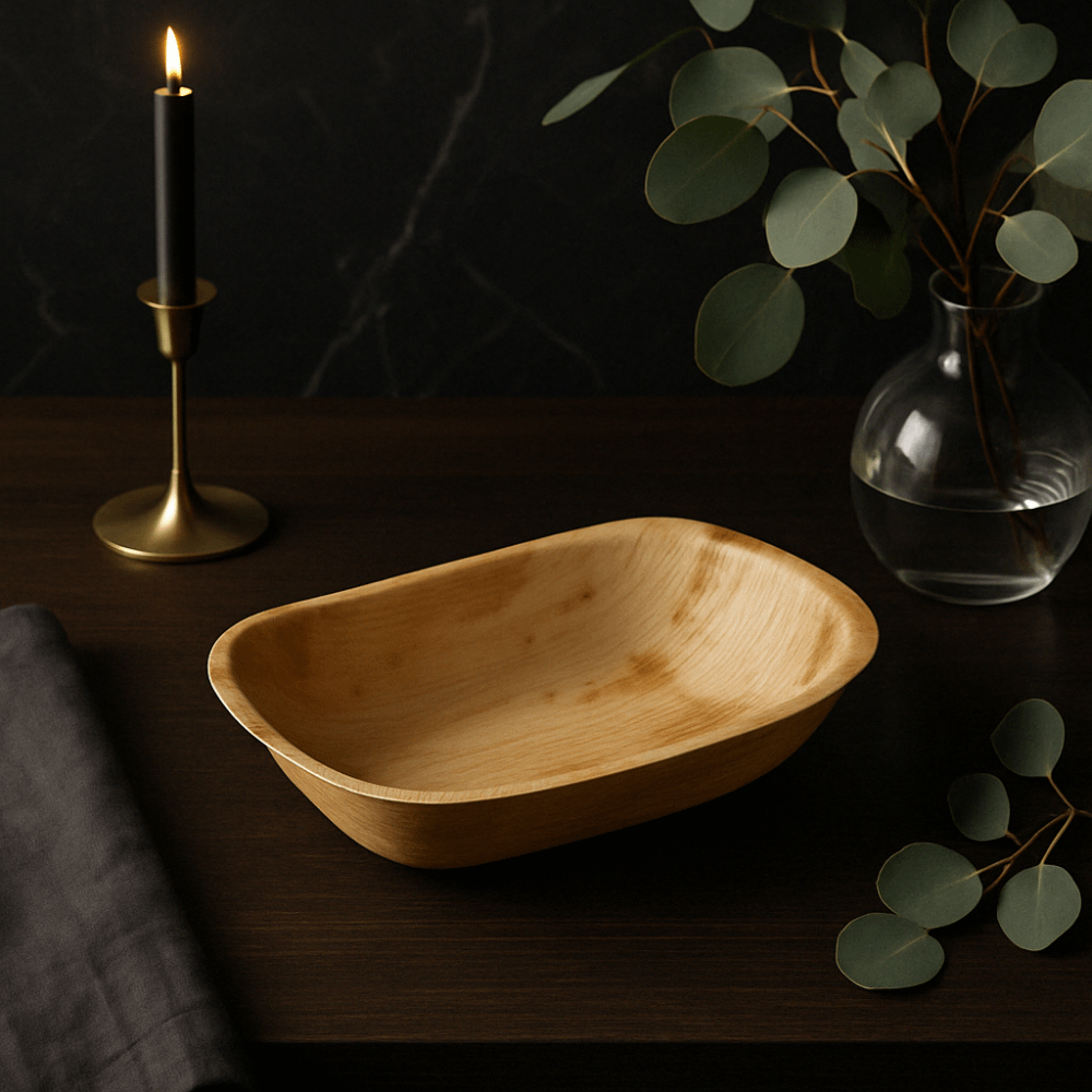Le style exotique et la forme de ces plateaux en feuilles de palmier biodégradables surprendront vos amis ou vos clients. La qualité du matériau permet également à ce produit d’entrer en contact avec les aliments. Notre produit est donc une valeur ajoutée certaine à votre proposition culinaire. Compte tenu de son impact esthétique considérable, il s’agit clairement d’un produit idéal pour ceux qui veulent surprendre par la sophistication de son style entièrement naturel. Il sera une solution idéale pour les cérémonies, les traiteurs, les restaurants qui organisent des dîners ou des déjeuners sophistiqués, mais aussi pour les agritourismes et les lieux qui proposent des apéritifs. Convient également aux mariages et à la restauration écologique.