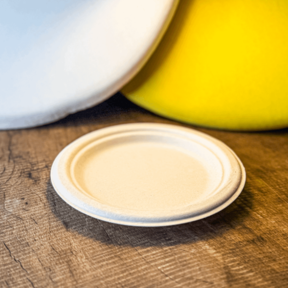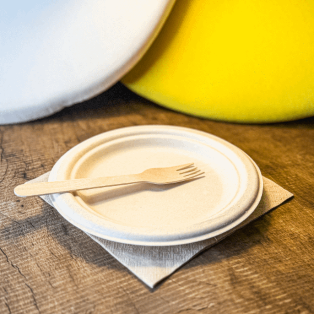 Les assiettes personnalisées compostables à usage unique sont fabriquées en pâte de cellulose non blanchie : un matériau naturel issu de déchets végétaux tels que la canne à sucre, le bambou et la paille.