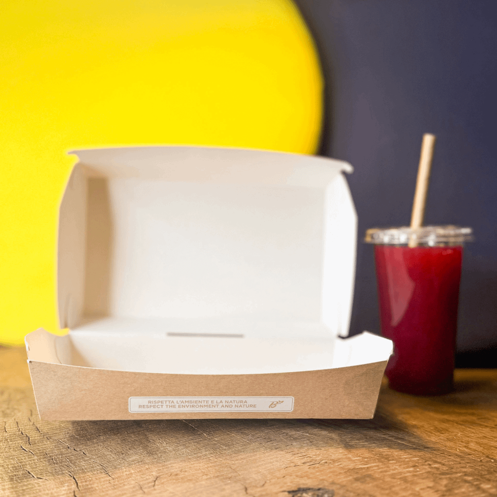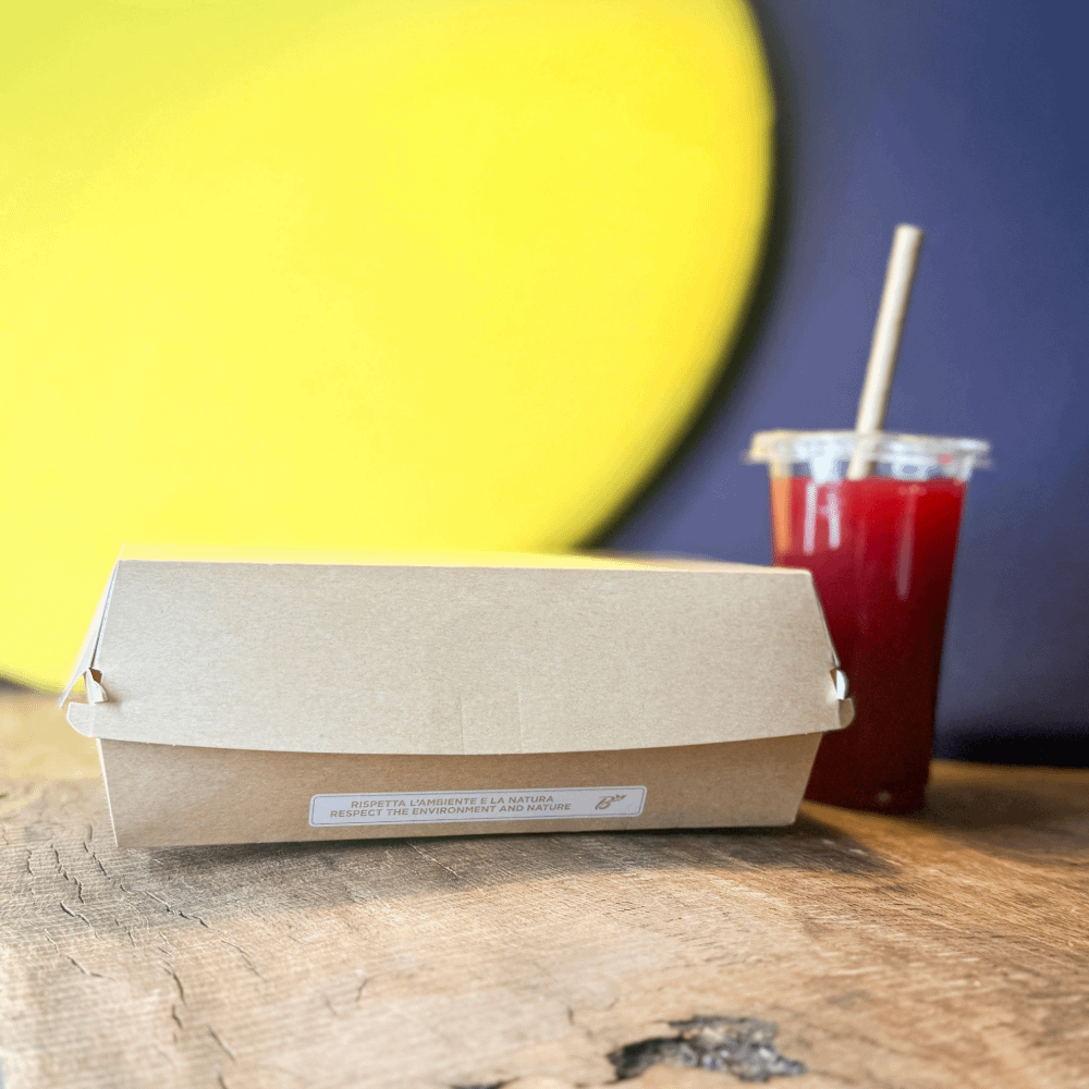 La boîte sandwich en carton est fabriquée à partir de carton laminé avec un biopolymère compostable. Cela signifie qu’une fois sa fonction remplie, elle peut être éliminée avec la fraction organique issue de la collecte sélective des déchets.