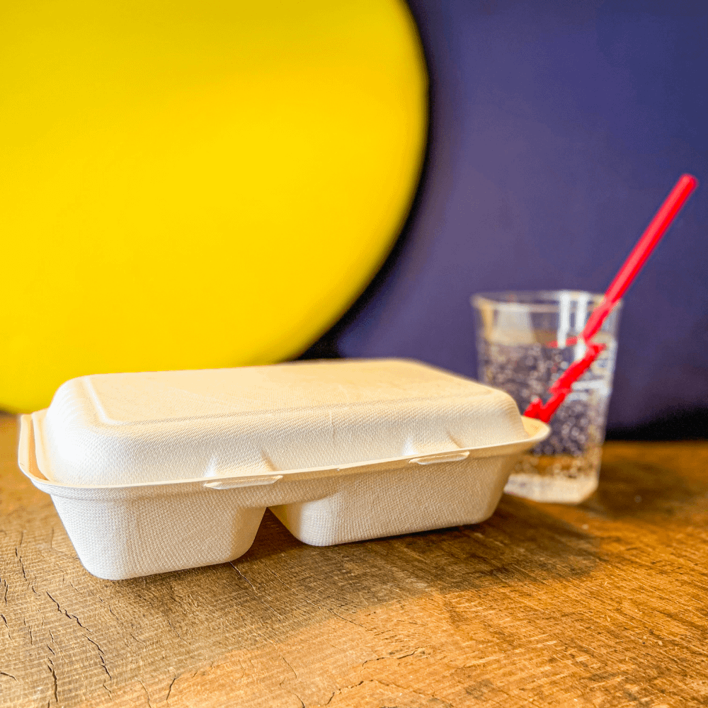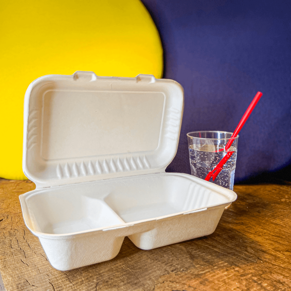 Les conteneurs compostables à deux compartiments sont fabriqués en pâte de cellulose. La pâte de cellulose est écologiquement durable tout au long de son cycle de vie et, étant dérivée de déchets végétaux à croissance rapide, elle contribue à la réduction des émissions de CO2.
