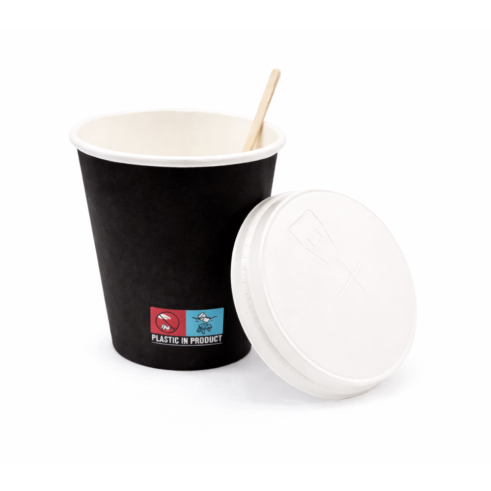 Grâce à leur revêtement intérieur à base d’eau, ces gobelets noirs compostables empêchent toute désintégration éventuelle du carton au contact de boissons chaudes.