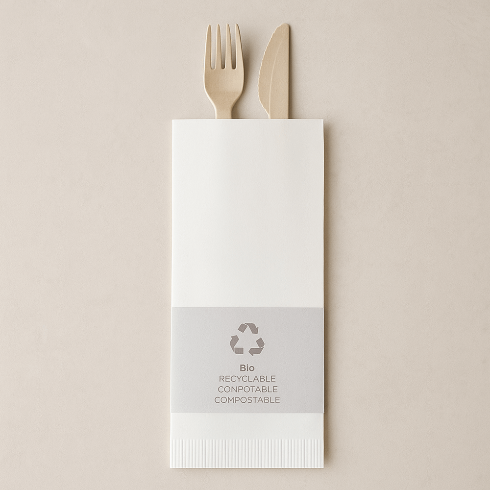 Le sac à couverts blanc avec serviette biologique jetable est fabriqué en papier blanc et contient une serviette en ouate écologique, respectueuse de l’environnement et compostable.