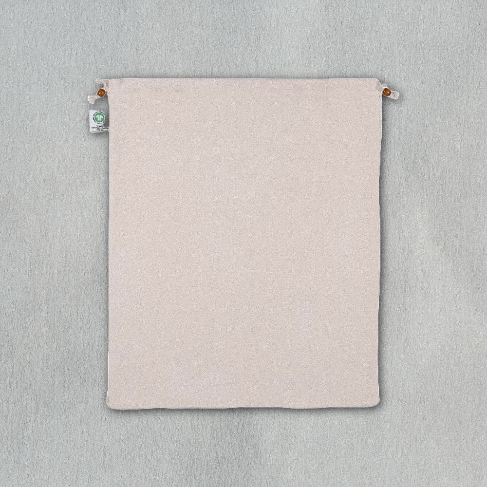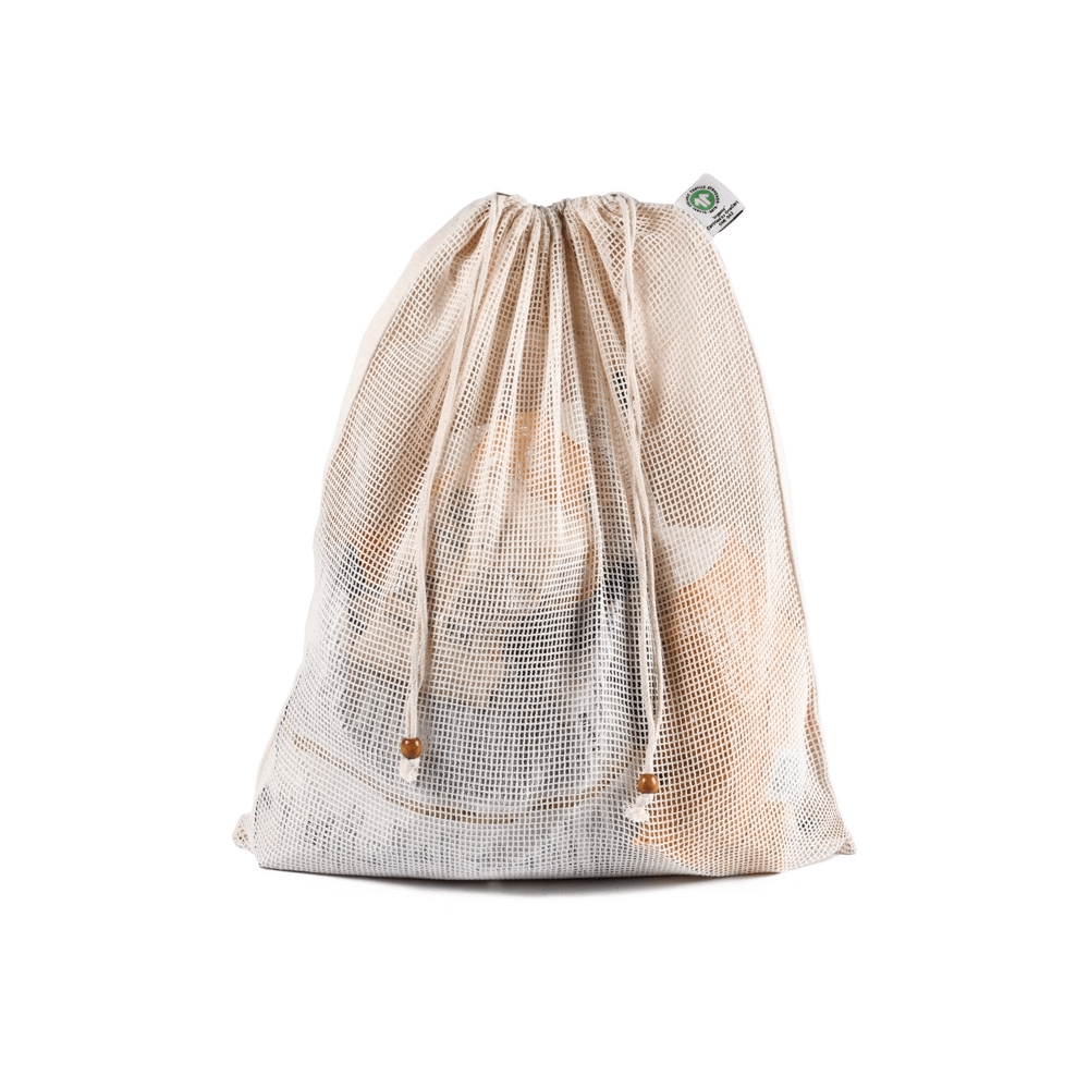 Fabriqué en coton biologique de 300 g/m², il garantit résistance et durabilité, tandis que la structure en filet assure la respirabilité, empêchant l’accumulation d’humidité dans les produits frais.
