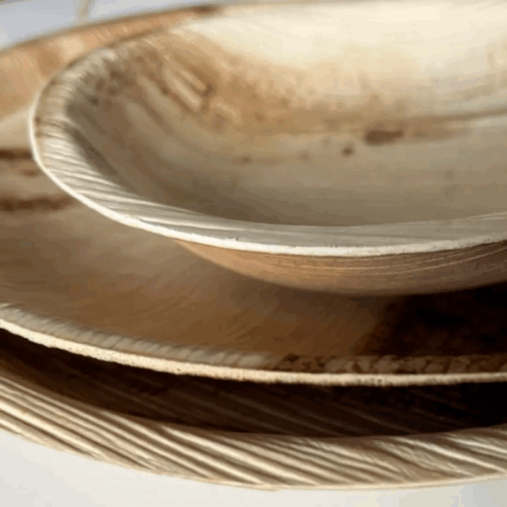 Questi servizi di piatti eleganti compostabili sono realizzati in foglia di palma. Si tratta di un materiale completamente naturale che si ottiene dopo una semplice procedura di lavaggio e pressaggio delle foglie senza alcuna aggiunta di altri materiali o sostanze.